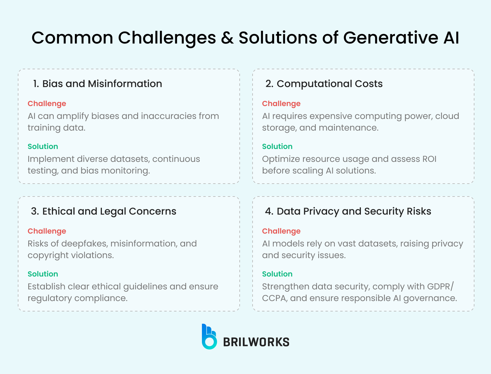 Generative AI models often require access to large datasets, which can include sensitive or proprietary information. This raises concerns about data security, regulatory compliance, and potential breaches. With data protection laws like GDPR and CCPA in place, businesses must ensure they are handling user information responsibly and safeguarding against unauthorized access.