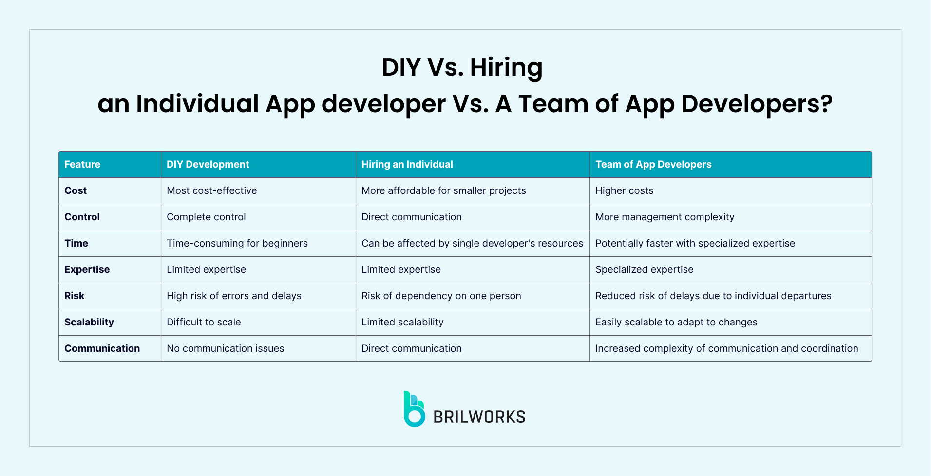When it comes to creating a mobile app, you have several options: DIY development, hiring an individual developer, or assembling a team of app developers. Each approach has its pros and cons.